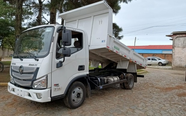 O caminhão da marca Aumark, Modelo Foton S60, tem motor Cummins ISF 2.8 L com potência de 150 cavalos, torque de 360 Nm, transmissão ZF 5S 368 e caçamba basculada.
