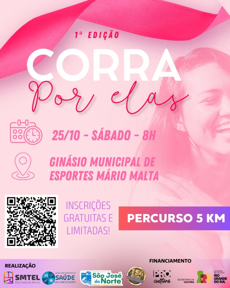 A Prefeitura Municipal de São José do Norte, através da Secretaria Municipal de Saúde e da Secretaria Municipal de Turismo, Esporte e Lazer, convida você para participar da primeira edição da Corrida “Corra por Elas”, que acontece no dia 25/10, às 8h, com saída do Ginásio Municipal de Esportes Mário Malta.