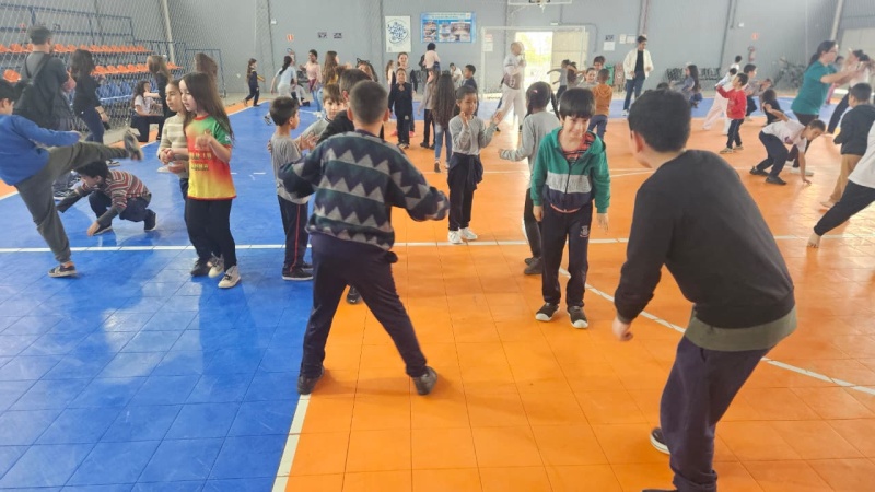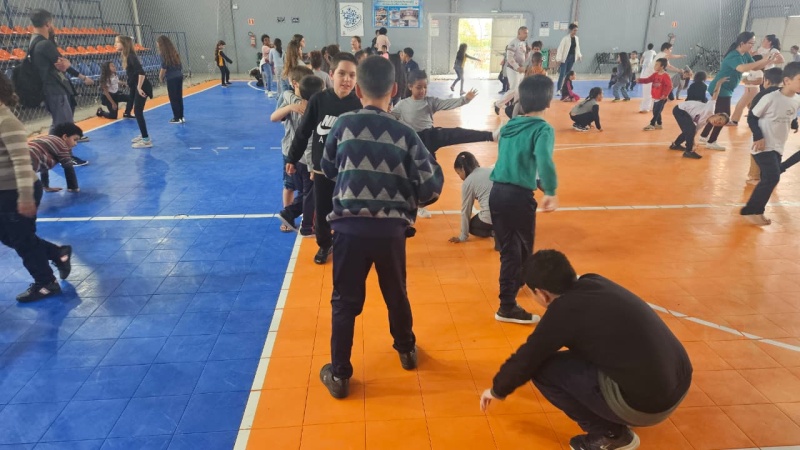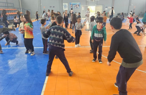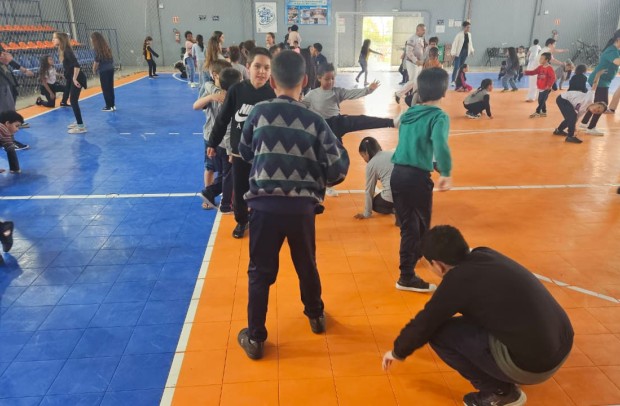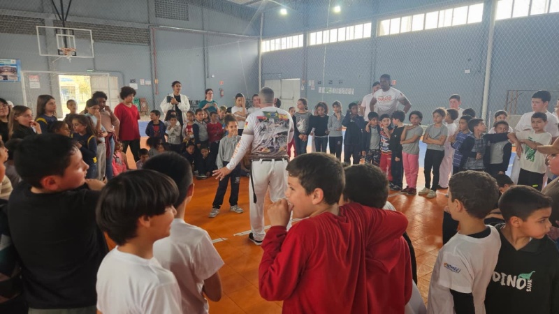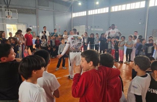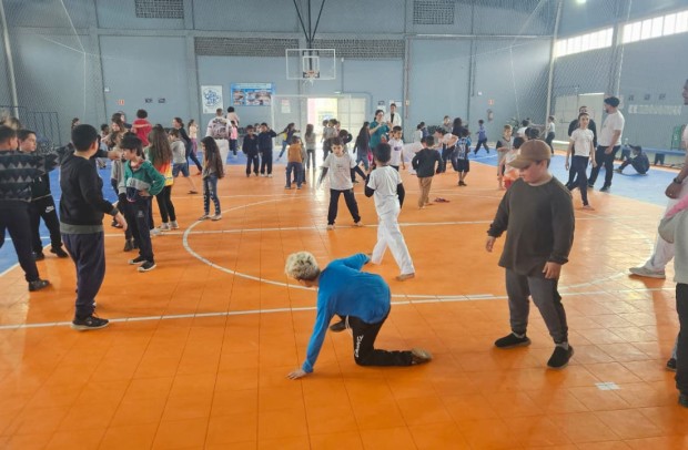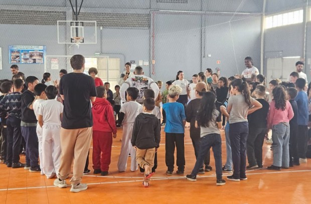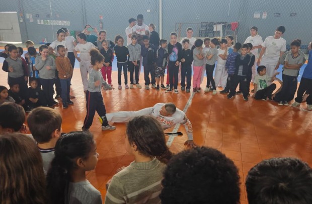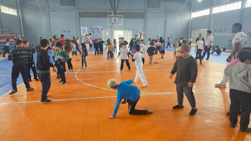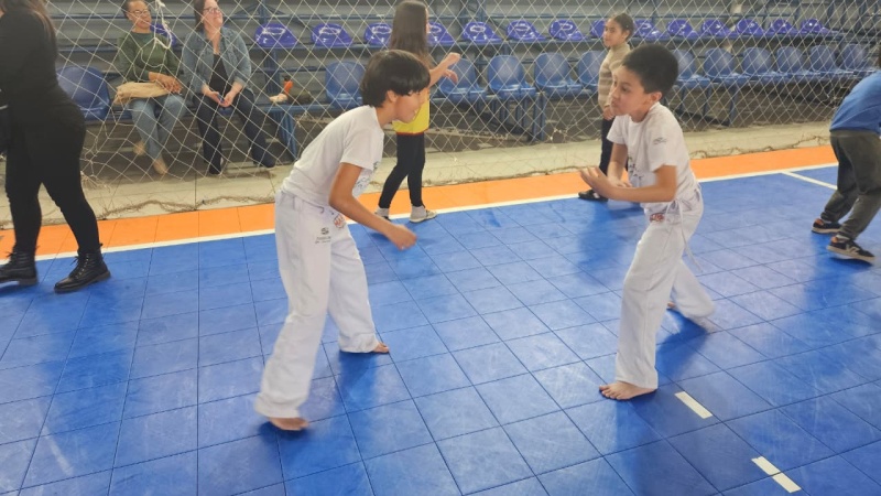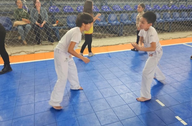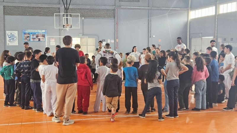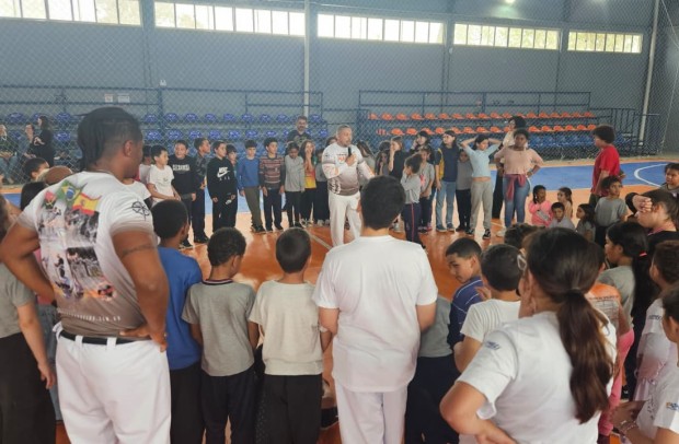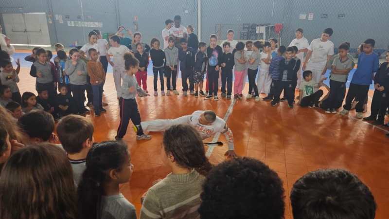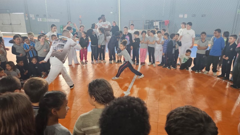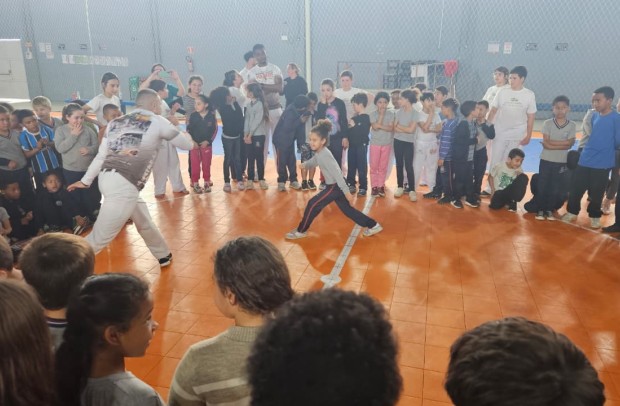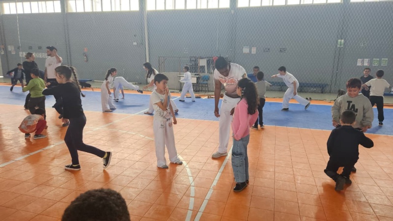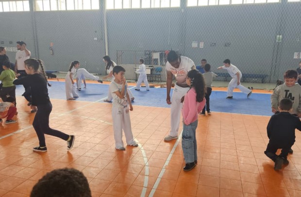Na tarde desta sexta-feira, 03 de outubro, o Ginásio Municipal Mário Malta foi palco do Aulão Solidário de Capoeira, que reuniu mais de 60 crianças em uma vivência de cultura, música e esporte. O evento foi promovido pela Secretaria Municipal de Educação e Cultura (SMEC) e pelo Casarão do Saber e da Inovação, com condução do professor de capoeira William Rocha, em parceria com o Grupo de Capoeira Marauê e o mestre Esquilo.