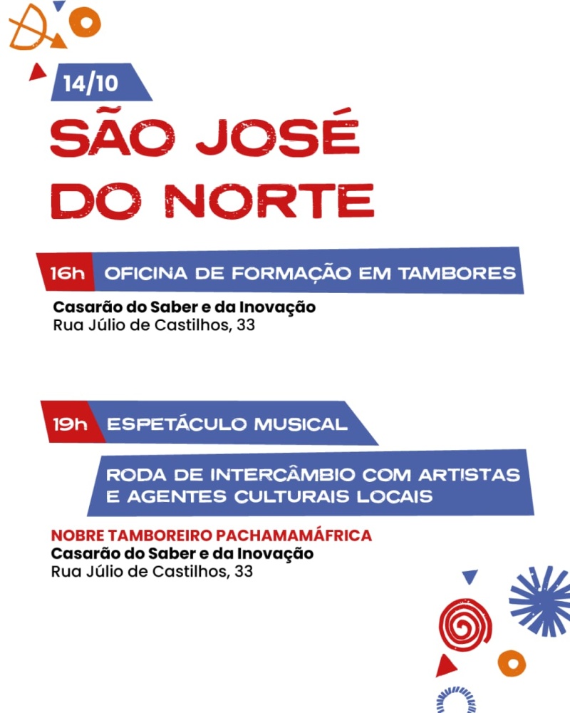São José do Norte recebe no dia 14 de outubro o projeto Nobre Tamboreiro PachamamÁfrica, contemplado no Edital da SEDAC/RS com recursos da Política Nacional Aldir Blanc. A programação ocorre no Casarão do Saber e da Inovação, com entrada gratuita e intérprete de Libras.