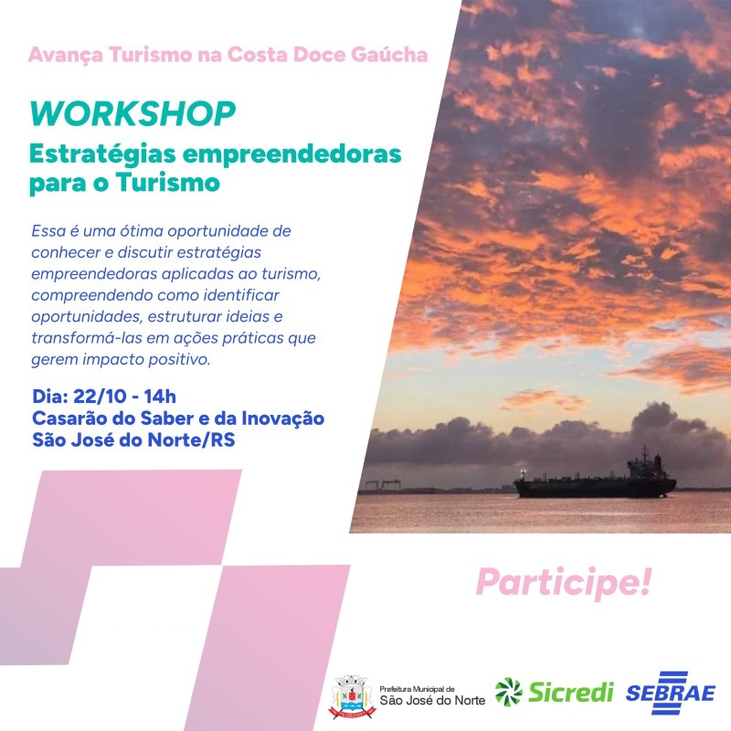 Como parte da programação alusiva aos 194 anos de emancipação política de São José do Norte, a Prefeitura, em parceria com o SEBRAE, promoverá no dia 22 de outubro, às 14h, o Workshop “Estratégias Empreendedoras para o Turismo”, no Casarão do Saber e da Inovação.